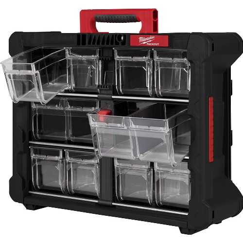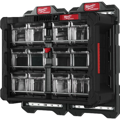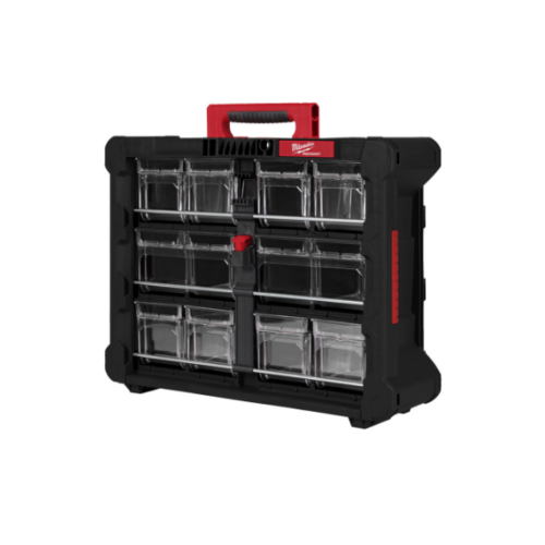 Tilbehørskoffert med 10 vippebokser, 8 små og 2 store transparente rom. Boksene kan tippes og tas helt ut. Passer til oppbevaring av mindre gjenstander som skruer, bits, spiker osv. Ergonomisk håndtak for komfortabelt grep og transport. Laget av slagfast materiale. Verktøykassen kan monteres på monteringsplate for veggmontering. Inngår i Milwaukees modulære oppbevaringssystem Packout.