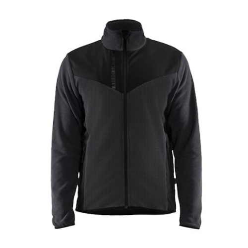 Strikket jakke med krage i stilig design og behagelig fleecekvalitet. Et elastisk materiale i jaquardstrikk med børstet bakside. Materialet er mykt, behagelig og har god isolasjonsevne. Forsterkende softshell-paneler på de utsatte områdene av jakken. Høy ventilasjon takket være fravær av softshell i armhulene. Forsterket skulderområde. Frontlukking med enveis glidelås i plast. Innvendig klaff. Frontlomme og brystlomme med glidelås. Forlenget nederkant bak. Elastikk i linning og mansjetter. Passer både til jobb og fritid. Vaskes ved 40 °C.