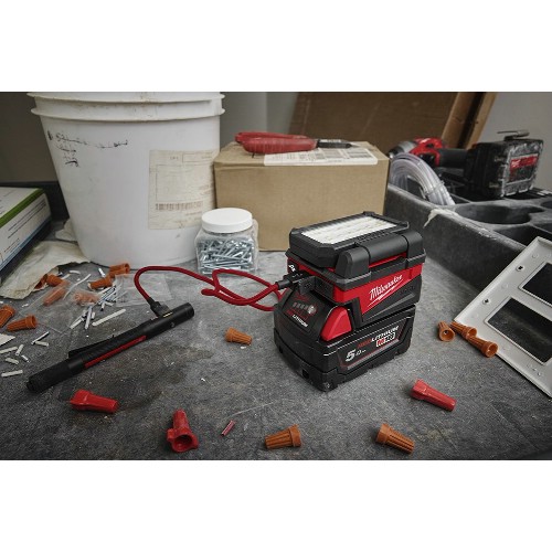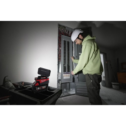 Effektiv LED-belysning med lysstrøm på 1000 lumen. Horisontal og vertikal justering av lys hodet. Integrert opphengskrok. Opptil 110 timers driftstid når den brukes med et M18 5,0 Ah Li-Ion-batteri. Beskyttelsesklasse IP54. Innebygd lader for lading av mobil enhet via USB-A (15 W) og USB-C (27 W). Fleksibelt batterisystem, passer alle Milwaukee M18-batterier.