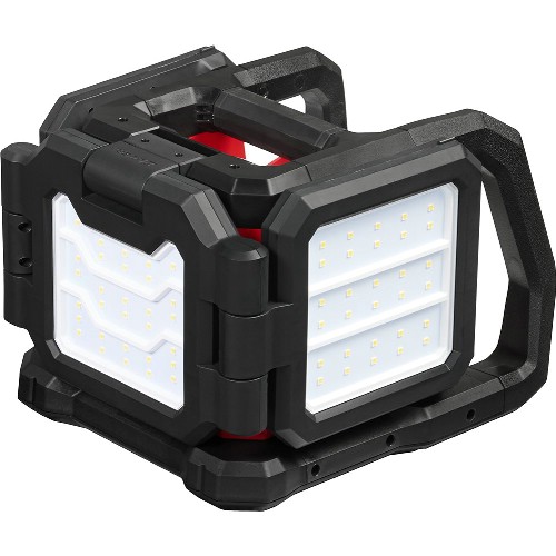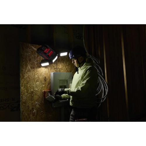 Høyeffektiv og kraftig LED-belysning med lysstrøm opptil 4500 lumen. Slagfast konstruksjon, holdbar og støtbestandig design som tåler fall opptil 2 meter. Drives enten med Milwaukees 18 V Li-Ion-batteri eller med medfølgende strømkabel. Utstyrt med 3 LED-paneler med 270° horisontal rotasjon og 270° vertikal vinkling. Lysstrøm i tre trinn (høy/middels/lav). Med alle paneler tent har belysningen en driftstid på 3 t / 6 t / 11 t (høy/middels/lav) og en lysstrøm på 4500 lm / 2000 lm / 1200 lm (høy/middels/lav) sammen med et M18 5,0 Ah-batteri. Magnetisk base, integrert opphengskrok og skruehull for sikker montering på vegg. Integrerte håndtak for enkel transport. Beskyttelsesklasse IP20. Vekt: 3,05 kg. Fleksibelt batterisystem, kompatibelt med alle Milwaukee M18-batterier.