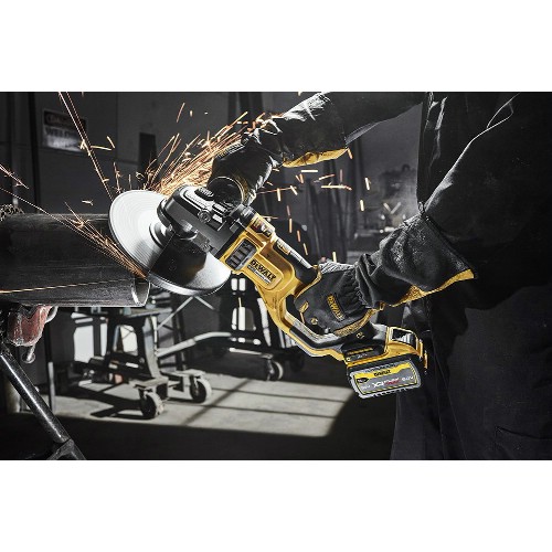 Kraftig 230 mm vinkelsliper XR Flexvolt 54 V Li-Ion med børsteløs motor. Trådløst verktøy som tilbyr driftstid og ytelse lik en nettdrevet maskin. Elektronisk brems stopper raskt skiven når man slipper avtrekkeren. Elektronisk kobling reduserer kickback ved kiling eller stopp. Mykstart muliggjør gradvis akselerasjon av hastigheten. Forsenket spindellås gir maksimal skjæredybde og bedre beskyttelse ved bruk i trange rom. Nett over ventilasjonsåpningen forhindrer at støv suges gjennom motoren. Gummibelagte bak- og sidehåndtak for godt grep og høy komfort. Sidehåndtak med 2 innstillinger. Verktøyfri justering av slip- og kappbeskyttelse. WTC, trådløs verktøykontroll som muliggjør sammenkobling med annen trådløs enhet, f.eks. en kompatibel støvsuger. Kompatibel med alle Dewalt 54 V Flexvolt-batterier og ladere.