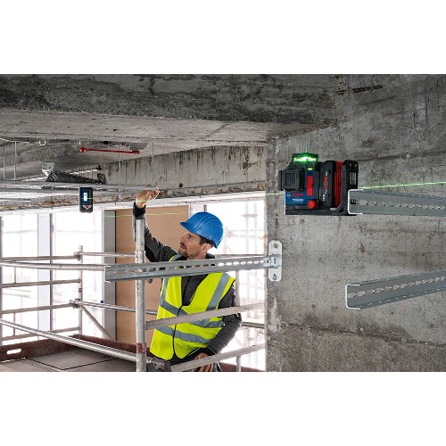 Sirkellaser med grønne laserlinjer for økt synlighet. Projiserer 3x360° klare og tydelige laserlinjer. Robust design med gummibelagt hylster, støv- og vannbeskyttelse i klasse IP65 for å tåle krevende miljøer. Arbeidsområde på opptil 30 m uten mottaker og opptil 120 m med mottaker (ikke inkludert). Selvjusteringsområde på opptil +/- 4° på 3 sekunder. Dual Power-funksjon, drevet av 18 V eller 12 V Li-Ion-batterier eller 4 stk. 1,5 V LR14-batterier (C). Opptil 20 timers driftstid i 3-linjers modus med 18 V 4,0 Ah-batteri. Integrert universalfeste med sterke magneter. 1/4" og 5/8" stativgjenger. Kompatibel med lasermottaker LR 7.